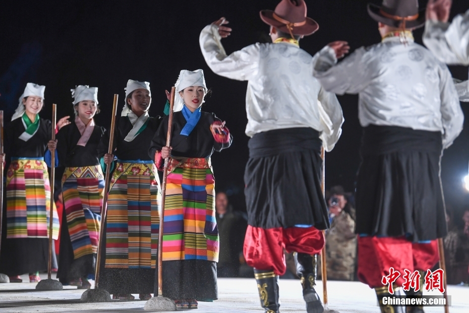 5月18日晚,西藏拉薩市當(dāng)雄縣納木錯(cuò)湖畔,當(dāng)?shù)啬撩駧в慰腕w驗(yàn)篝火鍋莊舞。納木錯(cuò),被譽(yù)為“天湖”,吸引著大量游客前來(lái)觀光。圖為篝火鍋莊舞晚會(huì)上的文藝演出。
