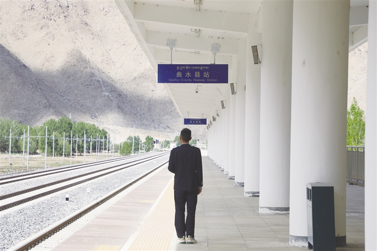 每天,清晨的第一縷陽光還未穿透遠(yuǎn)方的山巒時(shí),車站值班員賀文貴已經(jīng)站在曲水站的站臺上,開始了他日復(fù)一日的工作,查看股道是否有異物,是否有動(dòng)物進(jìn)入站場。曲水站與其他站不一樣,根據(jù)工作安排,平時(shí)這里只有一個(gè)人當(dāng)班應(yīng)急值守,沒有旅客上下站,時(shí)而駛過的火車,是這里唯一的來客。目之所及,只有遠(yuǎn)處的雪山、農(nóng)田和滾滾向前的雅魯藏布江水。