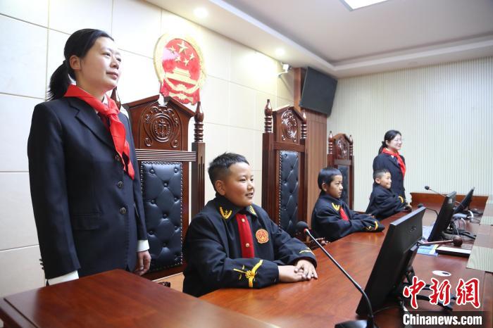 圖為學(xué)生們?cè)诜ü俚膸ьI(lǐng)下沉浸式體驗(yàn)?zāi)M法庭。倫珠澤仁攝