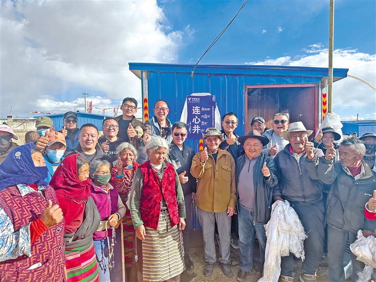霍爾巴鄉(xiāng)群眾在中國電信西藏公司投資修建的扶貧項目機(jī)井取水。