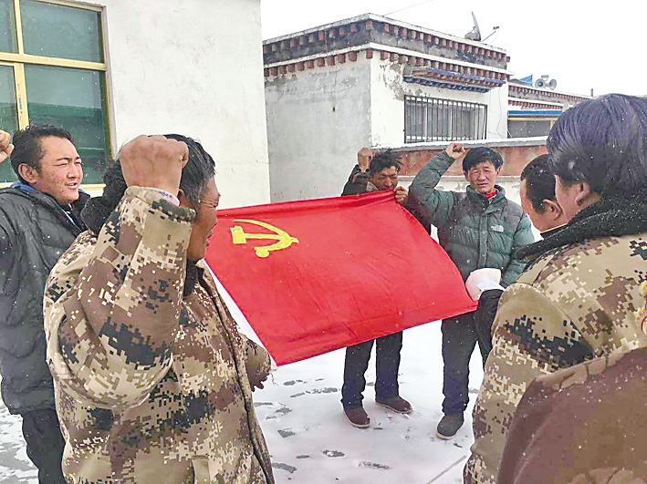 中國電信西藏公司駐霍爾巴鄉(xiāng)駐村工作隊與聯(lián)系點(diǎn)黨員干部重溫入黨宣誓。
