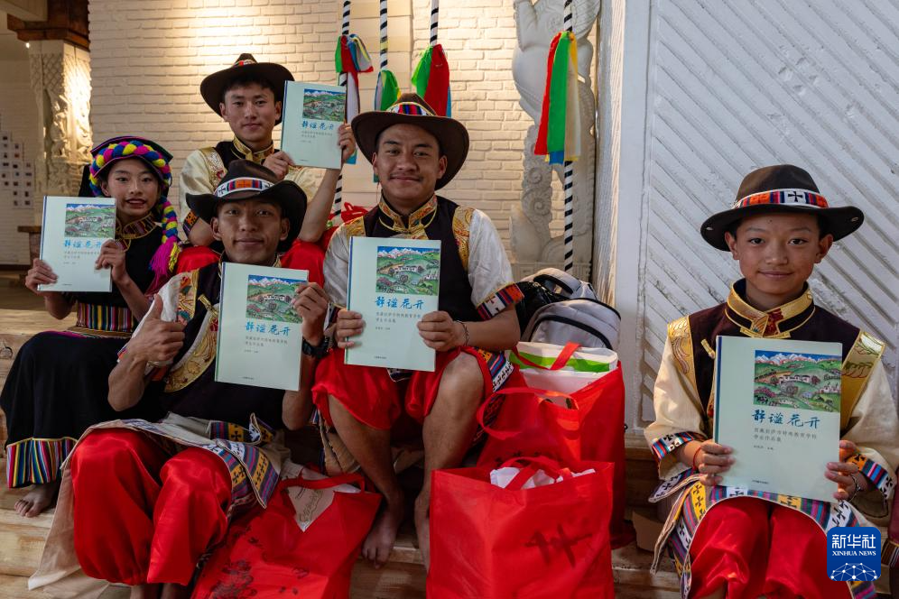 6月5日,拉薩市特殊教育學(xué)校的孩子們?cè)谛聲l(fā)布現(xiàn)場展示書籍。新華社記者 姜帆 攝