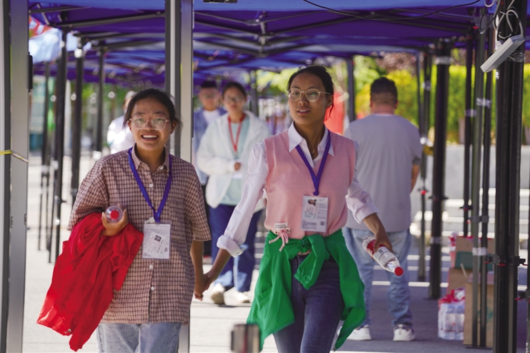 擊掌、擁抱……拉薩中學(xué)考點(diǎn)附近處處是為考生們加油的老師、家長(zhǎng)。有些家長(zhǎng)身著旗袍,有的老師手拿向日葵……給孩子加油打氣。