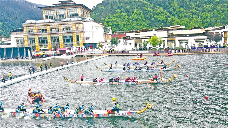 6月10日,2024年西藏林芝南迦巴瓦高原體育大會(huì)魯朗中尼高原龍舟友誼賽精彩上演。來自尼泊爾、新加坡和北京市、云南省以及拉薩市、林芝市等多地的8支龍舟隊(duì),百余名運(yùn)動(dòng)員奮力揮槳、激流勇進(jìn),為廣大群眾和游客獻(xiàn)上了一場水上競技的“大餐”。
