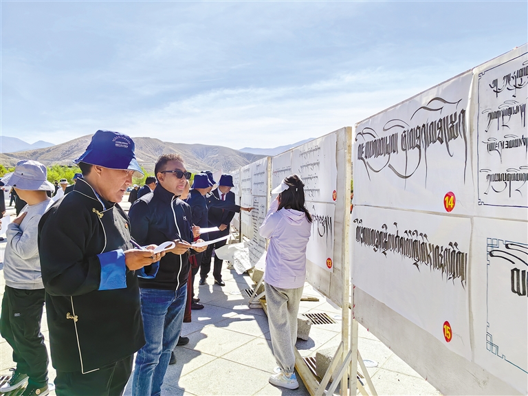 在謝通門縣開展的書法、繪畫、攝影比賽中,評(píng)委在為作品打分。