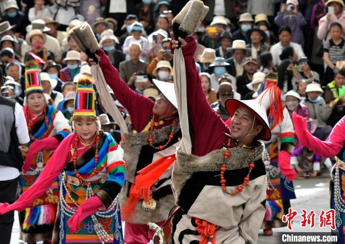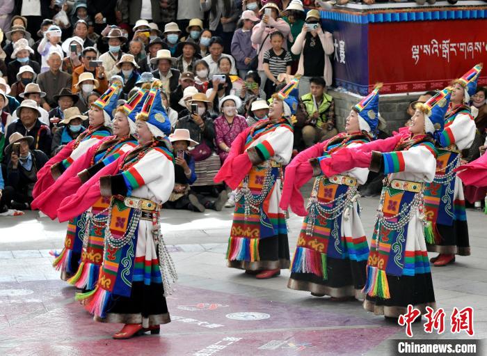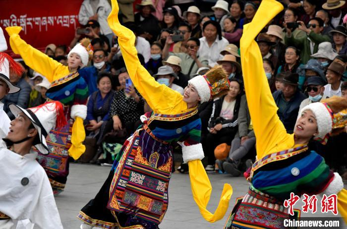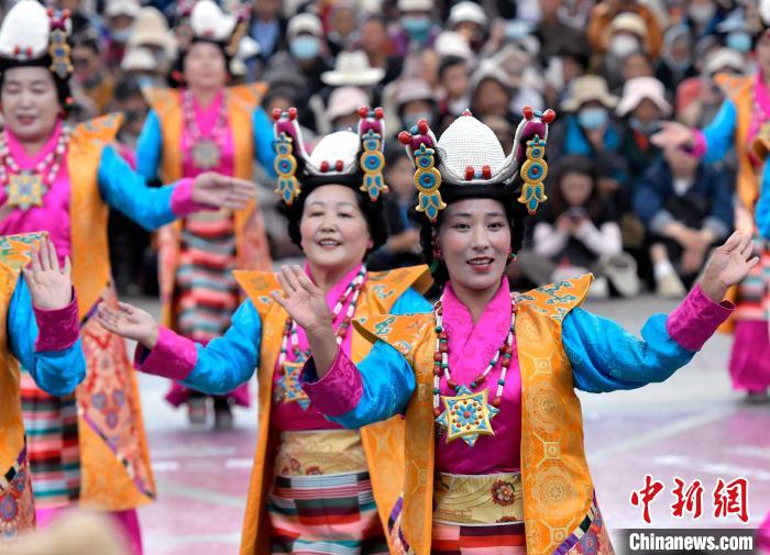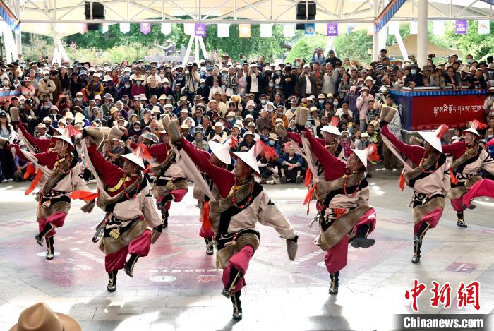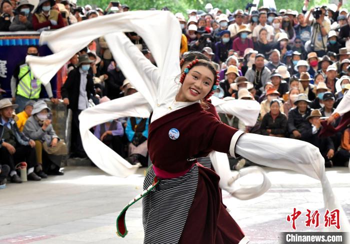 6月14日,第二屆拉薩鍋莊舞大賽決賽在布達(dá)拉宮腳下的宗角祿康公園舉辦,共有12支隊(duì)伍參賽。圖為鍋莊舞大賽決賽現(xiàn)場(chǎng)。中新社記者 李林 攝
