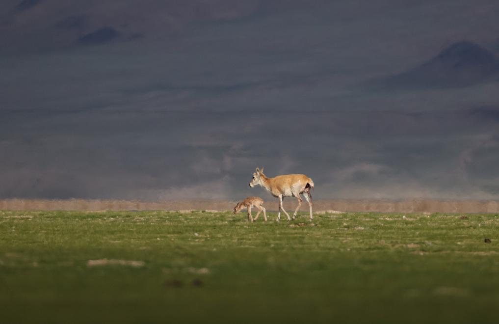 魯確塘草原上,藏羚羊護(hù)著剛出生的孩子(6月17日攝)。新華社記者 晉美多吉 攝