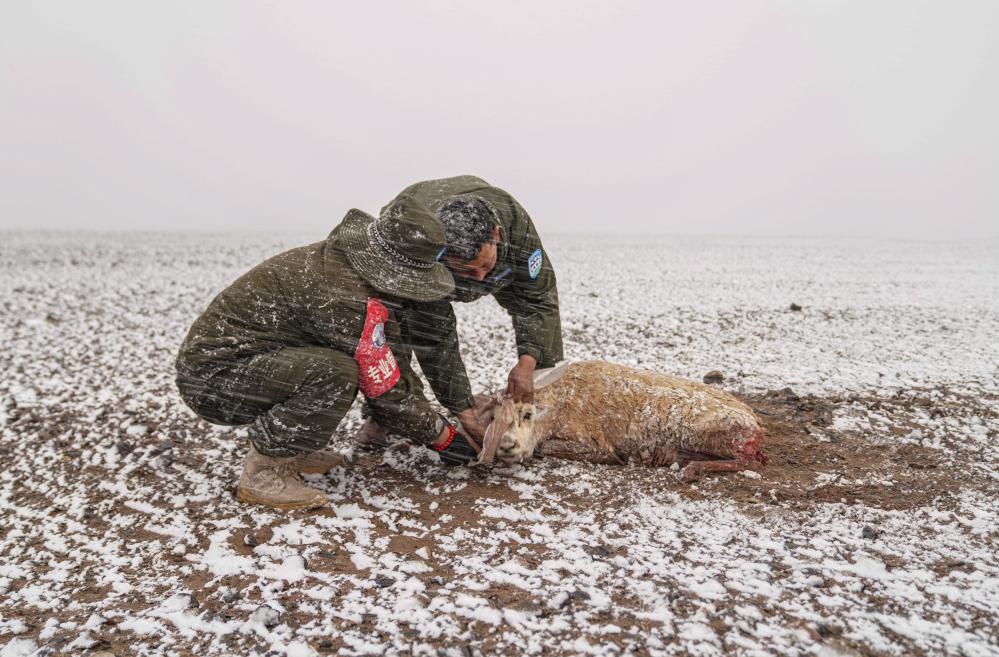 管護(hù)員在救治受傷的藏羚羊(6月14日攝)。新華社記者 晉美多吉 攝