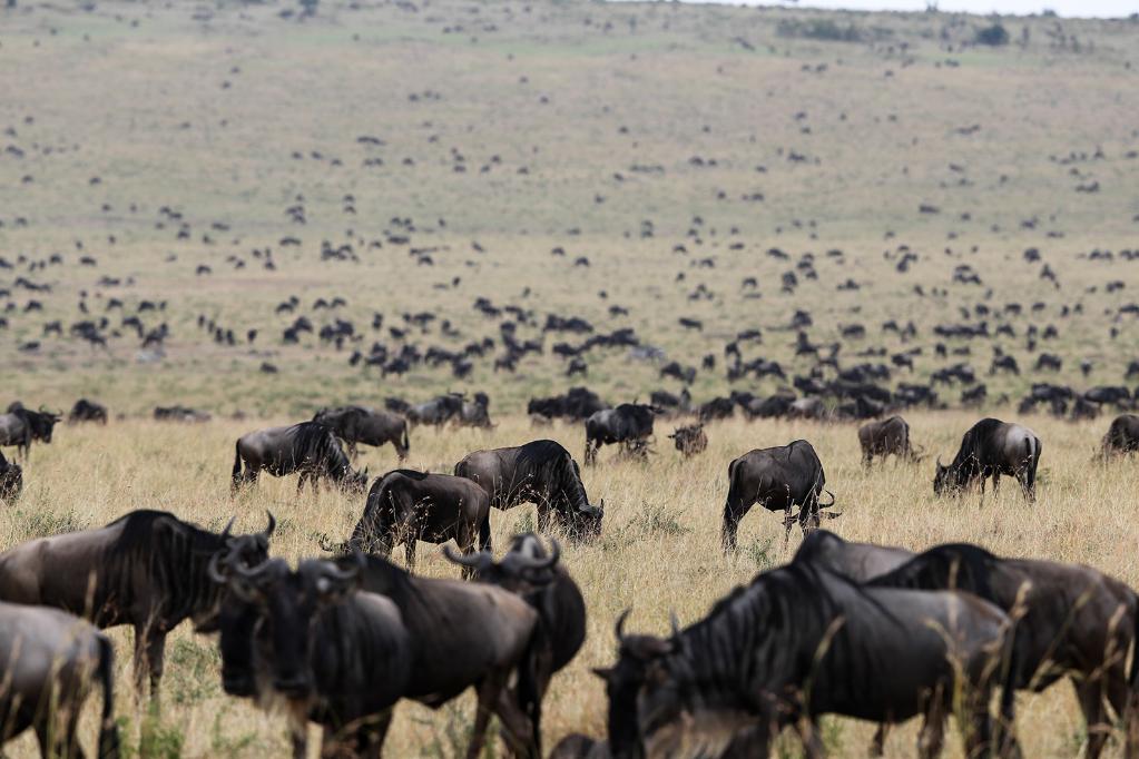↑ 在馬賽馬拉國家保護區(qū),遷徙中的野生動物在草原上覓食。