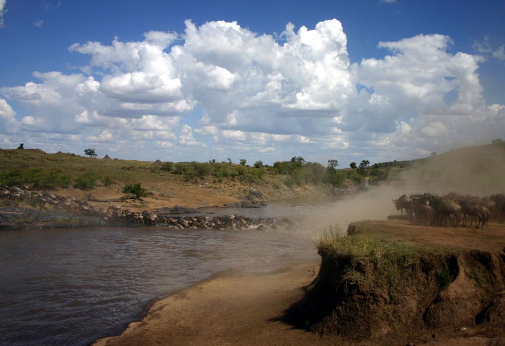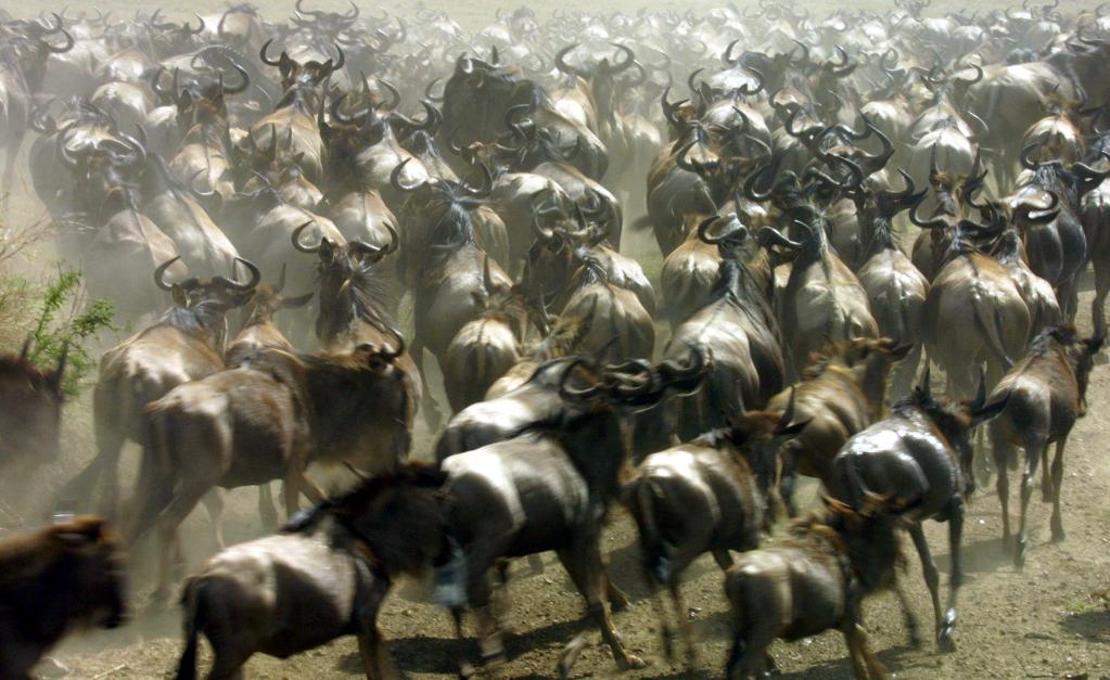 ↑ 在馬賽馬拉國家保護區(qū),遷徙中的角馬越過馬拉河。馬拉河“生死之渡”是整個大遷徙過程中最為壯觀和驚心動魄的一幕。