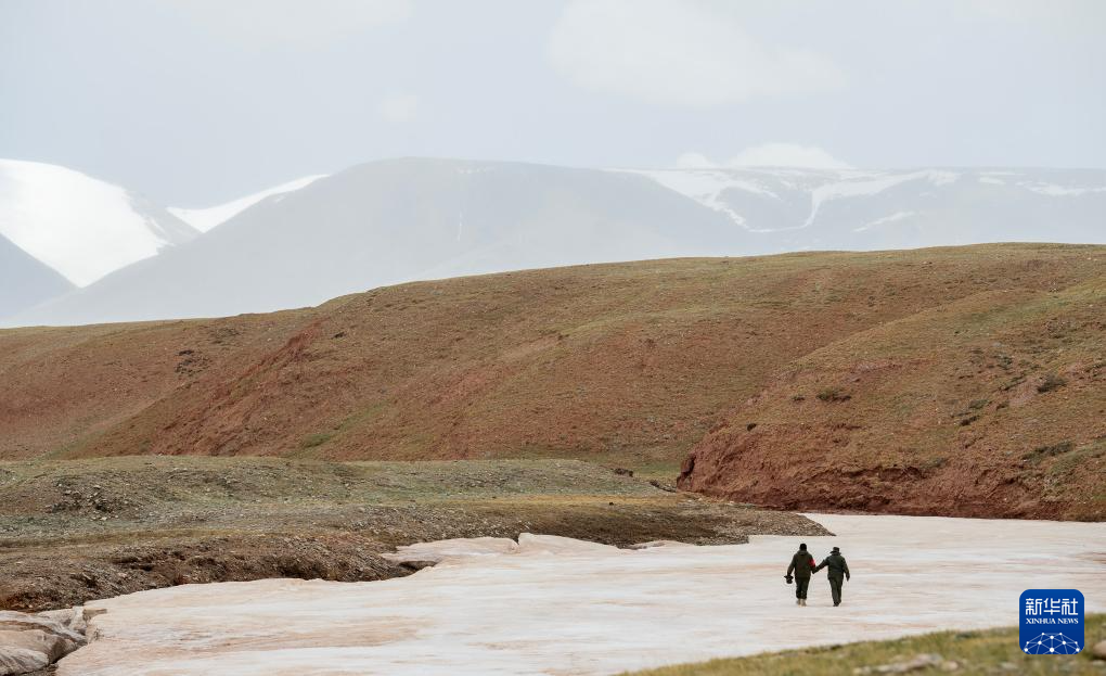6月15日,羌塘國(guó)家級(jí)自然保護(hù)區(qū)野生動(dòng)物專(zhuān)業(yè)管護(hù)隊(duì)員索朗(右)和羅布檢查河面冰凍情況。新華社記者 費(fèi)茂華 攝