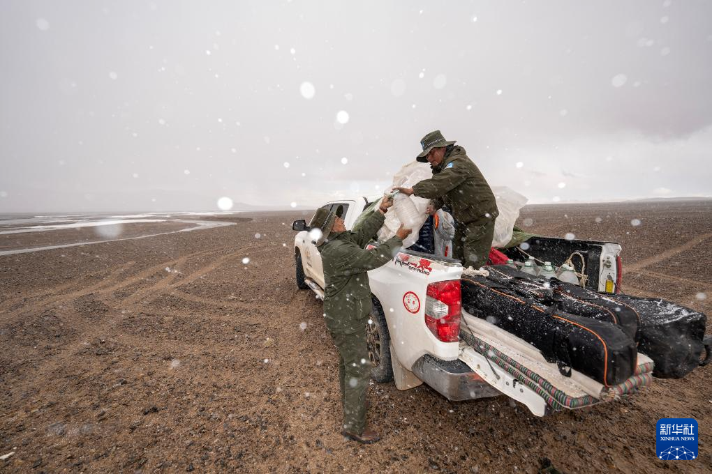 “快快快,天要黑了,趕緊把帳篷扎起來(lái)!”羌塘國(guó)家級(jí)自然保護(hù)區(qū)羅布玉杰野生動(dòng)物管護(hù)站站長(zhǎng)格桑倫珠對(duì)同事索朗和羅布說(shuō)到。