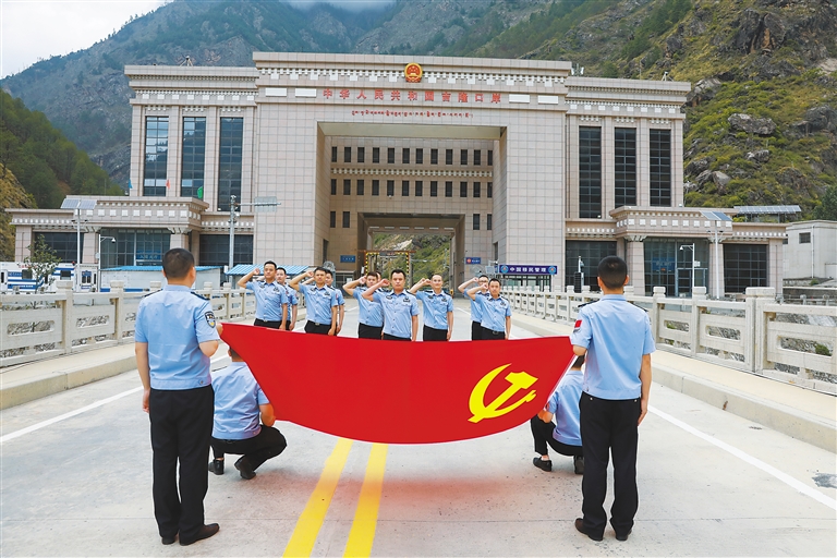 圖為吉隆出入境邊防檢查站組織黨員民警在國(guó)門(mén)前重溫入黨誓詞。記者 旦增蘭澤 通訊員 肖富貴 攝