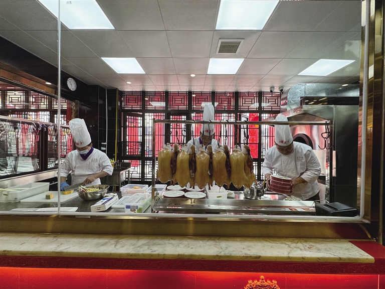 全聚德拉薩店選址于仙足島濱河路二期,店鋪設(shè)計匠心獨運,將古樸典雅的外部風(fēng)貌與簡約優(yōu)雅的現(xiàn)代內(nèi)部裝飾巧妙融合。墻壁上隨處可見的掛畫在介紹著店鋪歷史的同時,更為空間增添了一抹藝術(shù)氣息。開業(yè)當(dāng)天,隨著歡快的開場舞響起,慶典活動正式拉開帷幕。現(xiàn)場,片鴨師傅們以精湛的技藝展示著全聚德的獨特魅力,一只只色澤誘人的烤鴨在他們的巧手下化身為薄如蟬翼的鴨肉片,搭配新鮮的蔥絲、黃瓜條及特制甜面醬卷入薄餅中,一口咬下,鮮美與香甜在口中瞬間綻放,令人回味無窮。