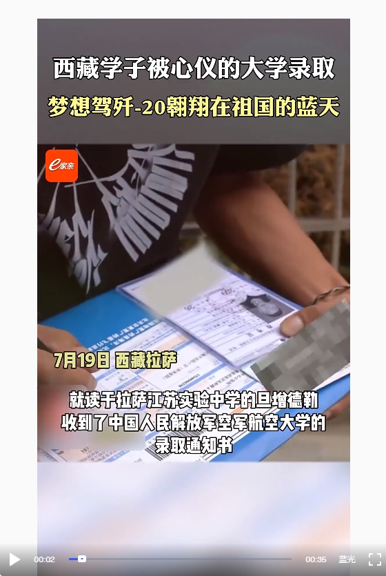 7月19日,就讀于拉薩江蘇實(shí)驗(yàn)中學(xué)的旦增德勒收到了中國(guó)人民解放軍空軍航空大學(xué)的錄取通知書,他是今年全區(qū)唯一一個(gè)被該大學(xué)錄取的藏族學(xué)子。旦增德勒表示,他的夢(mèng)想是開著殲-20在祖國(guó)的天空上翱翔。