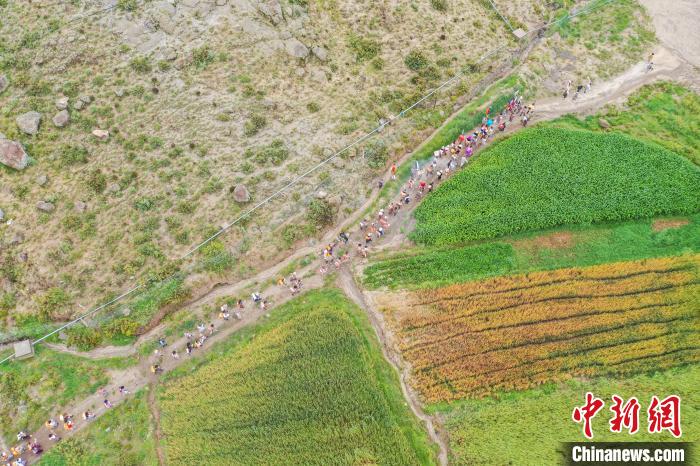 7月24日,西藏拉薩市曲水縣南木村迎來了一年一度的“望果節(jié)”。當(dāng)日,村民們盛裝打扮背上經(jīng)文,圍繞全村田園轉(zhuǎn)上一圈,轉(zhuǎn)到每一塊農(nóng)田前都要煨桑祈求風(fēng)調(diào)雨順、五谷豐登。“望果節(jié)”民俗已有1500多年的歷史,是國家級非物質(zhì)文化遺產(chǎn)。圖為曲水縣南木村村民身著盛裝背上經(jīng)文繞田。(無人機(jī)照片)中新社記者 貢嘎來松 攝