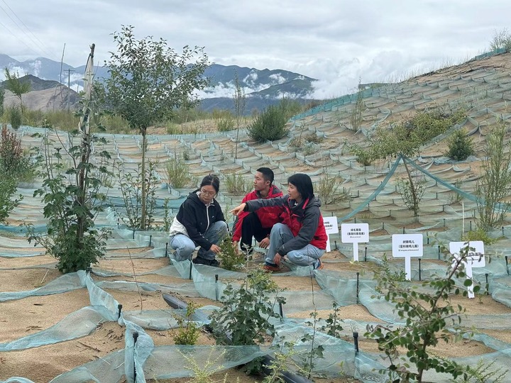 中國(guó)科學(xué)院成都山地災(zāi)害與環(huán)境研究所研究員周萍帶領(lǐng)研究生在西藏扎囊縣沙化土地生態(tài)治理綜合示范區(qū)開(kāi)展沙地試驗(yàn)樣方植被生長(zhǎng)狀況監(jiān)測(cè)。新華社記者 顧天成 攝