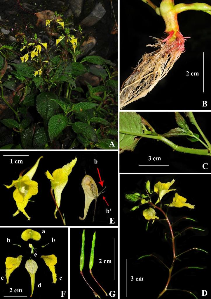 2022年,胡光萬研究員團隊在西藏隆子縣進行野外科考時發(fā)現(xiàn)一種獨特的鳳仙花,后經(jīng)形態(tài)比對和分子系統(tǒng)學(xué)分析,確定其為新物種,并將其命名為隆子鳳仙花。隆子鳳仙花與輻射鳳仙花在形態(tài)上最為接近,但隆子鳳仙花的莖、葉、葉柄和花梗上均被柔毛覆蓋,輻射鳳仙花全株無柔毛,兩者區(qū)別明顯。
