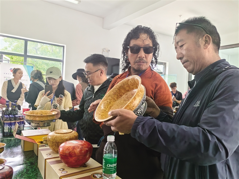 探訪團(tuán)在加查縣的非物質(zhì)文化遺產(chǎn)展覽上被加查服飾、竹編、石鍋和加查木碗等傳統(tǒng)手工藝品所吸引,這些手工藝品不僅展示了山南豐富的文化底蘊(yùn),還體現(xiàn)了當(dāng)?shù)厝嗣駥?duì)美好生活的追求和向往。