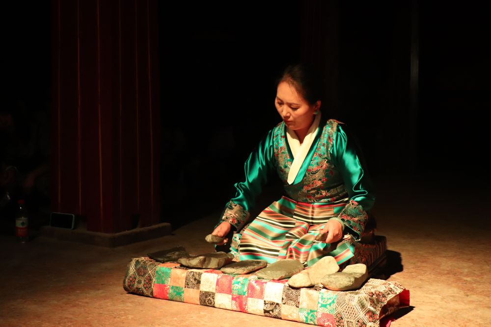 石琴使用天然的石塊作為伴奏樂(lè)器,從遠(yuǎn)古開(kāi)始就在高原上被人演繹。演奏者手持兩塊小石頭,跪坐在幾塊類(lèi)似琴鍵的大石頭前,大小石頭在不同位置碰撞出不同的音高,演奏者按一定音階順序?qū)⑹^排列在琴架上,演奏出悅耳的旋律。