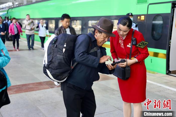圖為拉日鐵路列車乘務(wù)員服務(wù)藏族旅客。資料圖 馬生明 攝