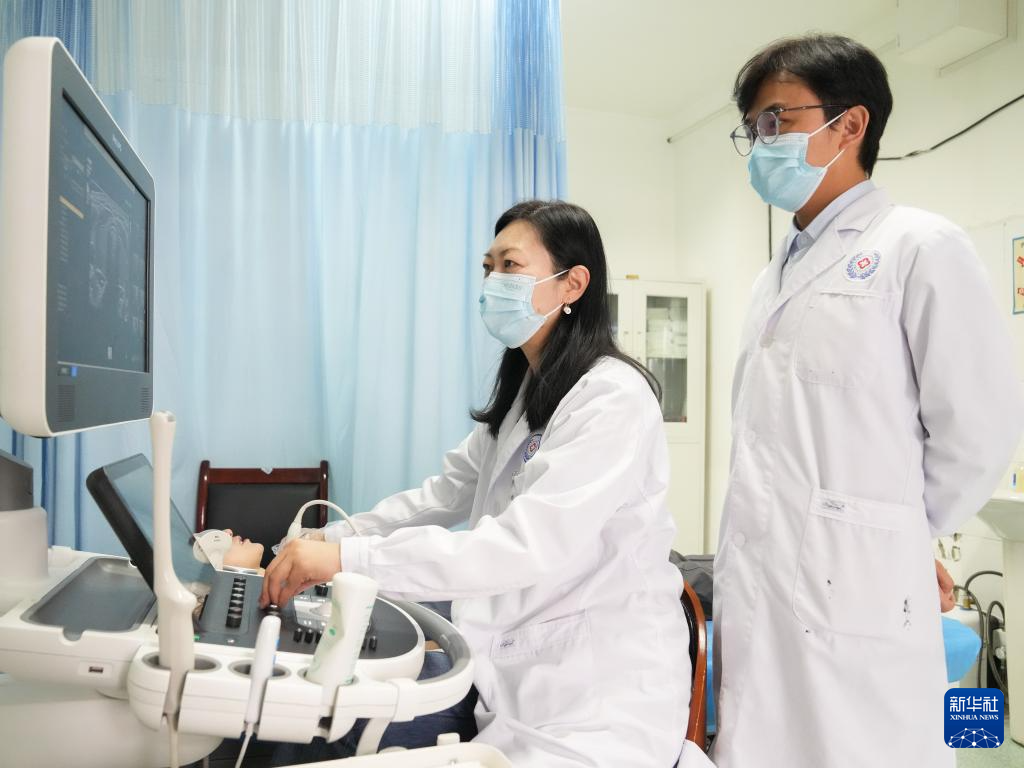 在西藏自治區(qū)人民醫(yī)院,徐鐘慧(左)與徒弟旦增晉美在為患者進(jìn)行超聲檢查(8月9日攝)。新華社記者 丁汀 攝