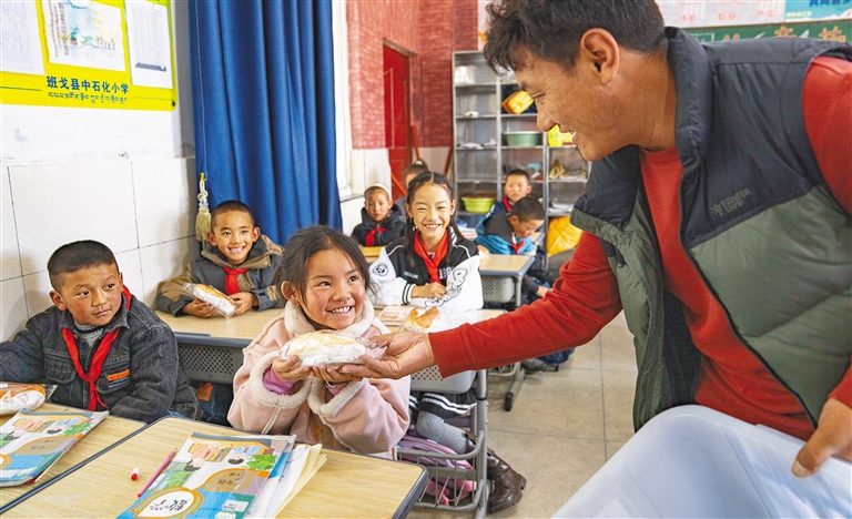 西藏那曲市班戈縣中石化小學(xué)是目前全國(guó)海拔最高的援藏小學(xué),由中石化集團(tuán)結(jié)對(duì)幫扶建立,2012年投入使用。圖為班戈縣中石化小學(xué)后勤副校長(zhǎng)尼旦為學(xué)生們分發(fā)營(yíng)養(yǎng)餐(資料圖片)。新華社記者 丁增尼達(dá) 攝