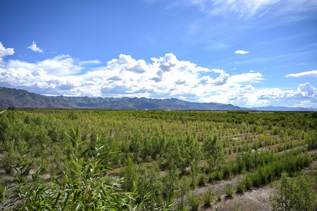 2024年9月1日,在雅江北岸南木林生態(tài)示范區(qū),郁郁蔥蔥的林木和湛藍的天空相映成景。新華社記者孫瑞博 攝