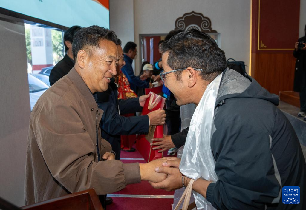 9月13日,參會專家向《格薩爾王傳》系列叢書編輯人員敬獻(xiàn)哈達(dá)。新華社記者 旦增尼瑪曲珠 攝