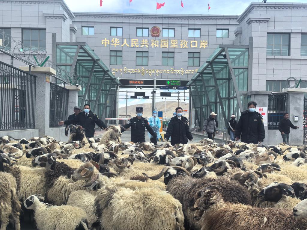 日喀則海關工作人員在里孜口岸監(jiān)管活羊出口。(受訪者供圖)