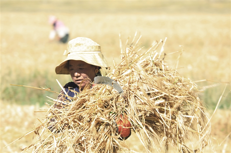 金秋九月,風(fēng)吹麥浪、穗粒飽滿,連日來,在墨竹工卡縣金黃色的農(nóng)田里,處處可見勤勞的農(nóng)民們搶抓時機,開展小油菜和青稞收割、晾曬、搬運、儲藏,確保糧食顆粒歸倉。