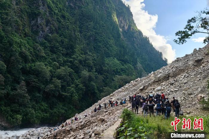圖為吉隆出入境邊防檢查站民警前往塌方路段接引尼籍邊民到吉隆口岸。郭章統(tǒng) 攝