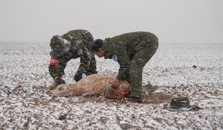 受傷的母羊在漫天風(fēng)雪中蹣跚了200多米后,倒下了。一直在觀望的索朗和羅布來到它身邊,輕輕地撫摸它的身體,口中念念有詞,然后用塑料布在母羊的腦袋旁邊“搭建”了一個小帳篷,為它擋風(fēng)遮雪,幫它度過最后的時光。