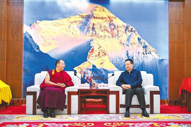 調(diào)研結(jié)束后,王君正在日喀則市會見了班禪額爾德尼·確吉杰布,對其在藏各項活動的順利開展、圓滿成功表示祝賀。王君正指出,班禪額爾德尼·確吉杰布回藏履職以來,深入貫徹習(xí)近平總書記關(guān)于宗教工作、西藏工作的重要指示和新時代黨的治藏方略,深入學(xué)習(xí)宣傳“三個意識”,廣泛接觸基層干部群眾和寺廟僧尼,積極宣傳黨的民族宗教政策,在推進藏傳佛教中國化、鑄牢中華民族共同體意識、引導(dǎo)信眾投身社會主義現(xiàn)代化新西藏建設(shè)等方面做了積極有效的工作。希望班禪額爾德尼·確吉杰布進一步學(xué)習(xí)領(lǐng)會習(xí)近平總書記重要指示精神,堅定不移維護祖國統(tǒng)一、加強民族團結(jié),全力維護社會和諧穩(wěn)定的良好局面;堅定不移推進藏傳佛教中國化,對教規(guī)教義作出通俗易懂、與時俱進的闡釋;堅定不移深化拓展“國家意識、公民意識、法治意識”教育,把各方面力量凝聚起來,奮力推進社會主義現(xiàn)代化新西藏建設(shè)。