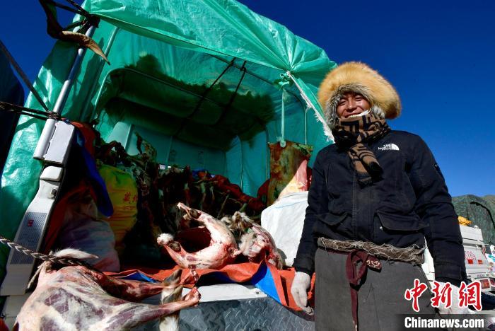 圖為畜產(chǎn)品展銷會(huì)上,牧民展示售賣的羊肉。李林 攝
