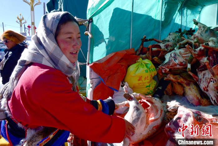 12月6日,西藏自治區(qū)那曲市申扎縣第十八屆畜產(chǎn)品展銷會現(xiàn)場,牧民整理售賣的羊肉。李林 攝