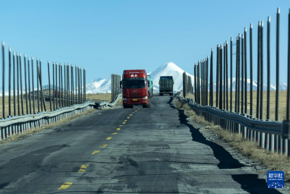 貨車從兩側(cè)遍布熱棒的青藏公路一段經(jīng)過(12月2日攝)。新華社記者 姜帆 攝
