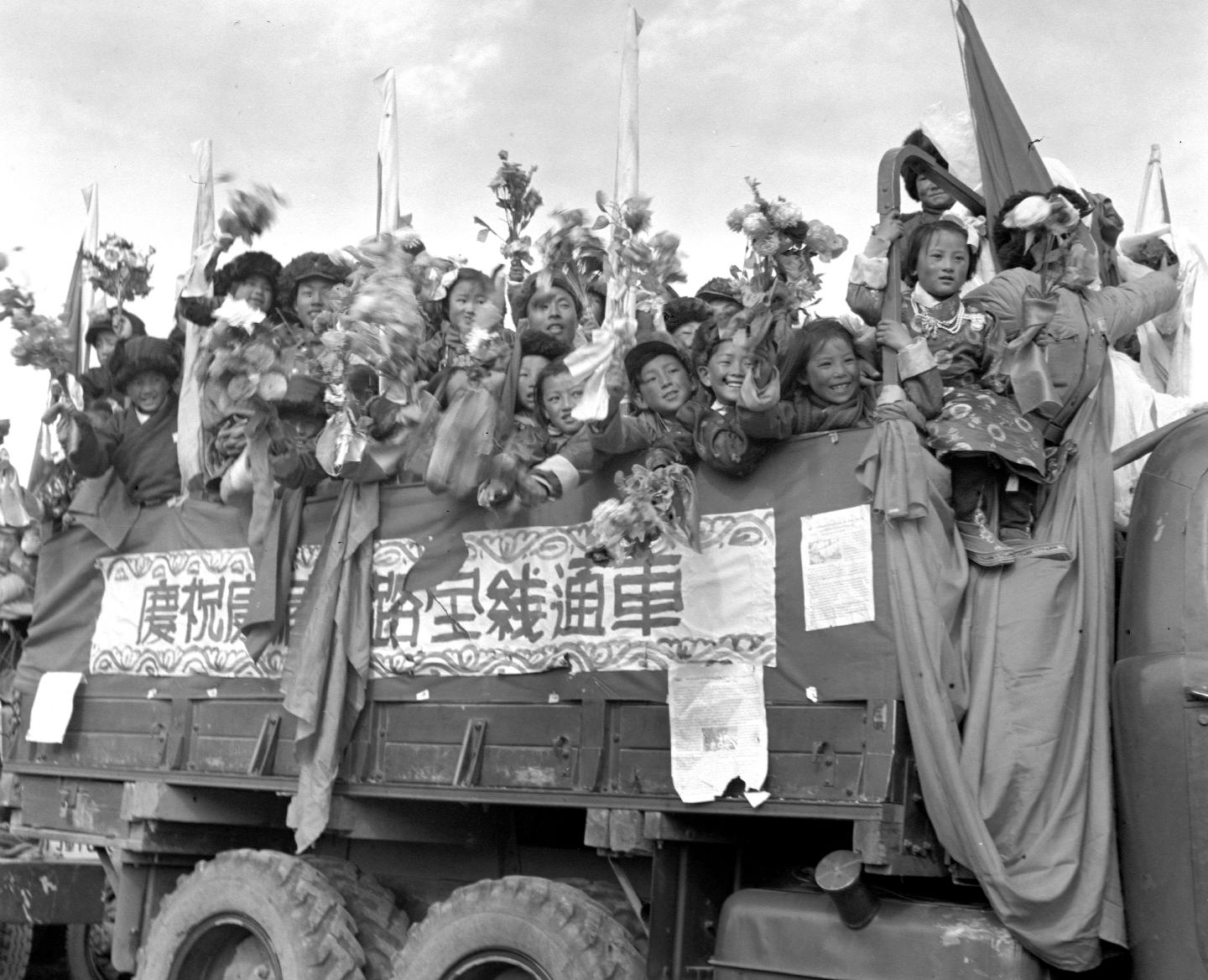 1954年12月25日,參加川藏、青藏公路通車(chē)典禮的藏族少年在拉薩愉快地乘上汽車(chē)。