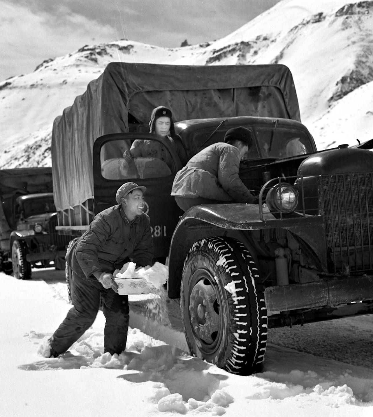1964年,解放軍一個(gè)汽車(chē)連隊(duì)的駕駛員在川藏公路上用洗臉盆端雪去冷卻油泵。