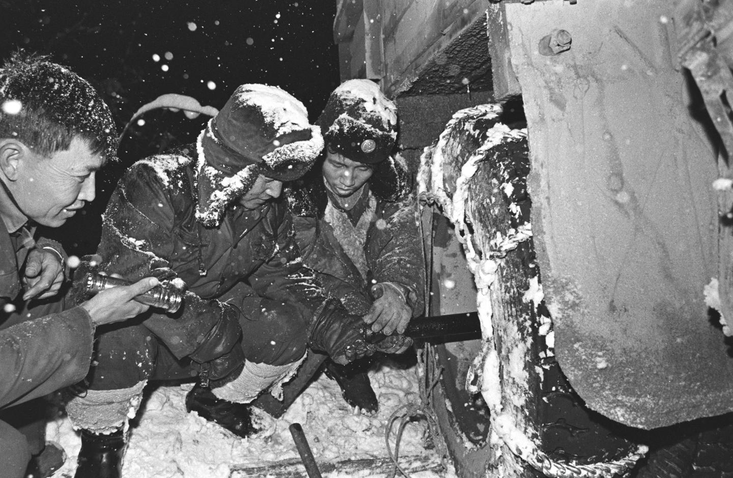 1985年3月中旬的一場(chǎng)罕見(jiàn)大雪中,川藏公路二郎山交通安全管理小組成員連夜搶修滿載援藏物資的運(yùn)輸車(chē)輛。