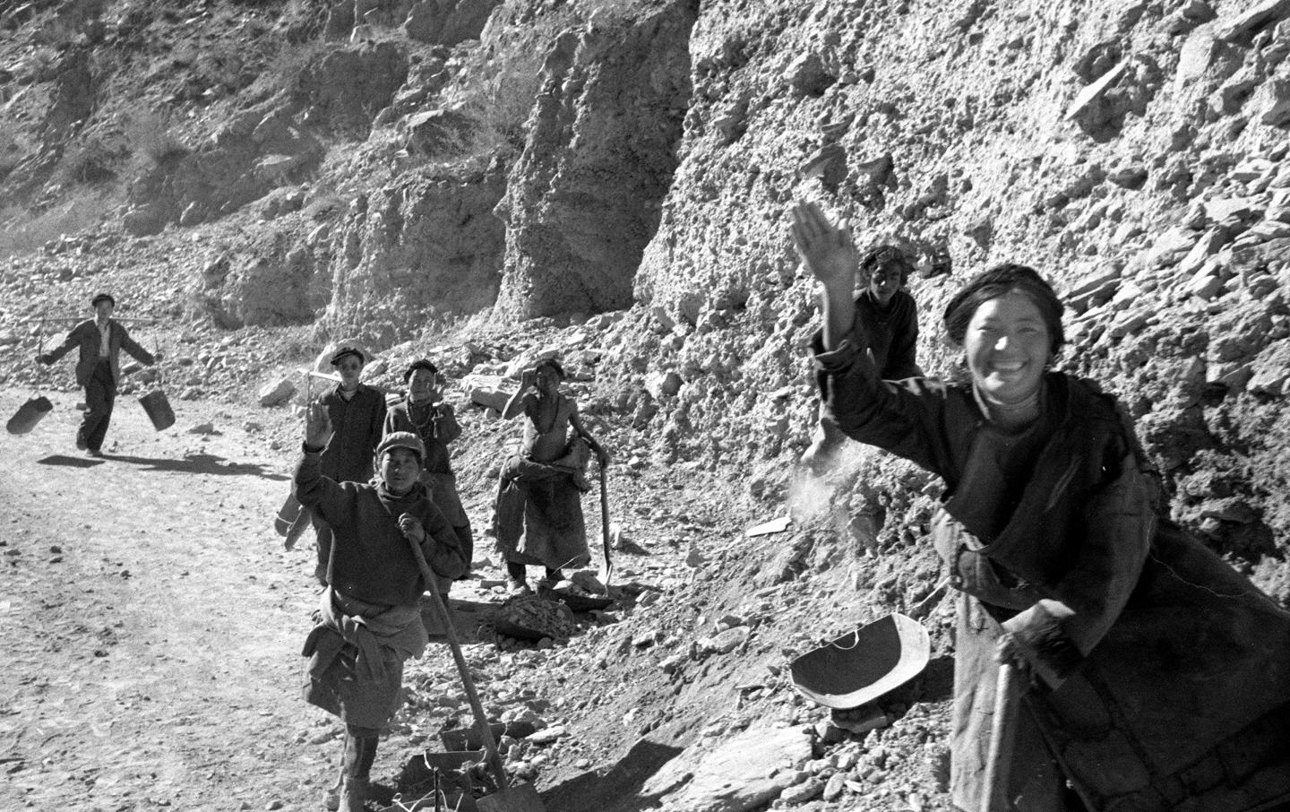 二十世紀(jì)60年代,在川藏公路上,辛勤的藏族養(yǎng)路工人熱情地向過(guò)路的旅客們揮手。
