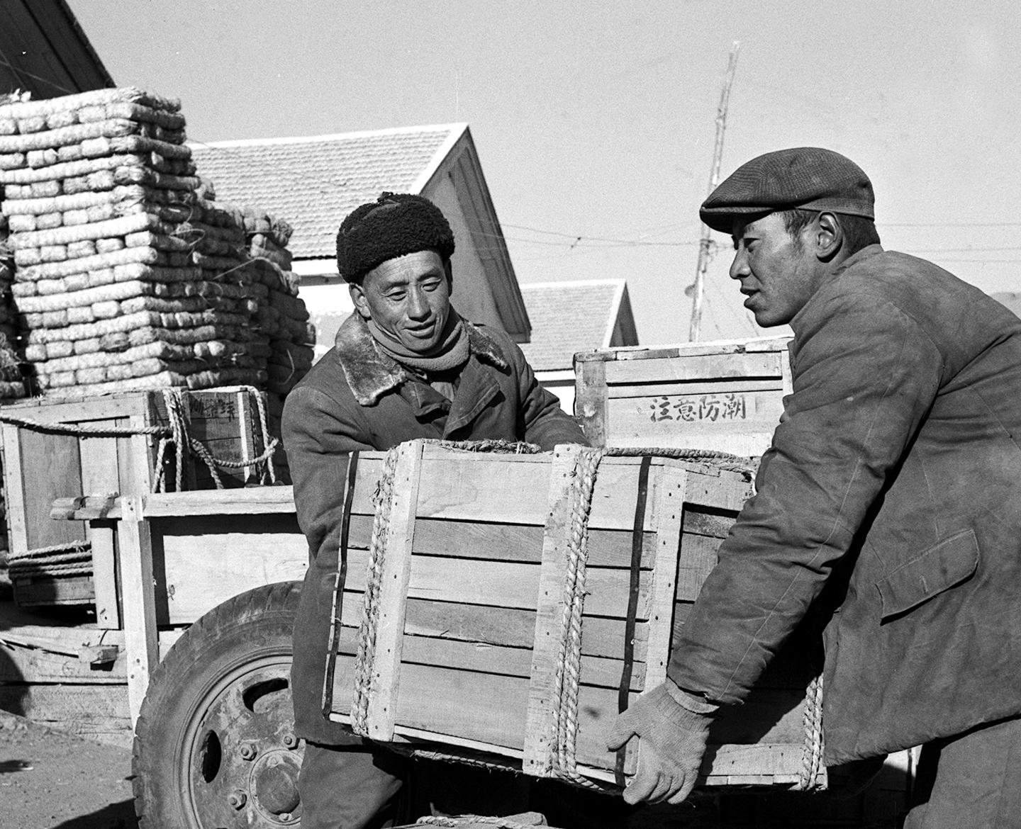 1964年,西藏山南貿(mào)易部門(mén)的工作人員在卸貨。不少生活用品沿著青藏公路和川藏公路源源運(yùn)進(jìn)西藏。