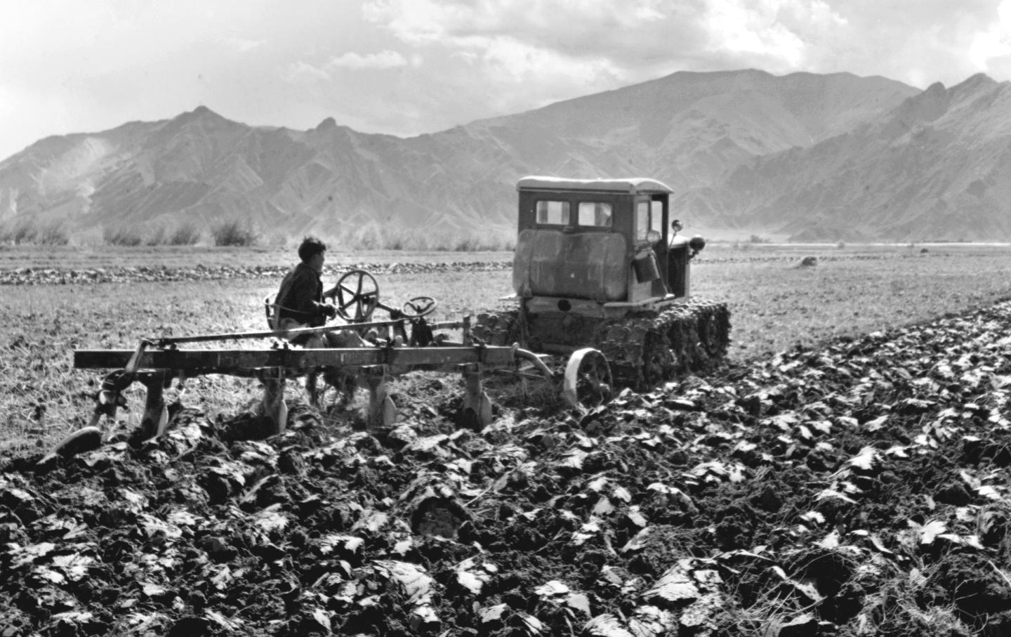 1964年,農(nóng)民使用拖拉機(jī)在拉薩郊外進(jìn)行秋耕。青藏公路和川藏公路通車(chē)后,許多新式農(nóng)具通過(guò)公路運(yùn)到了西藏。