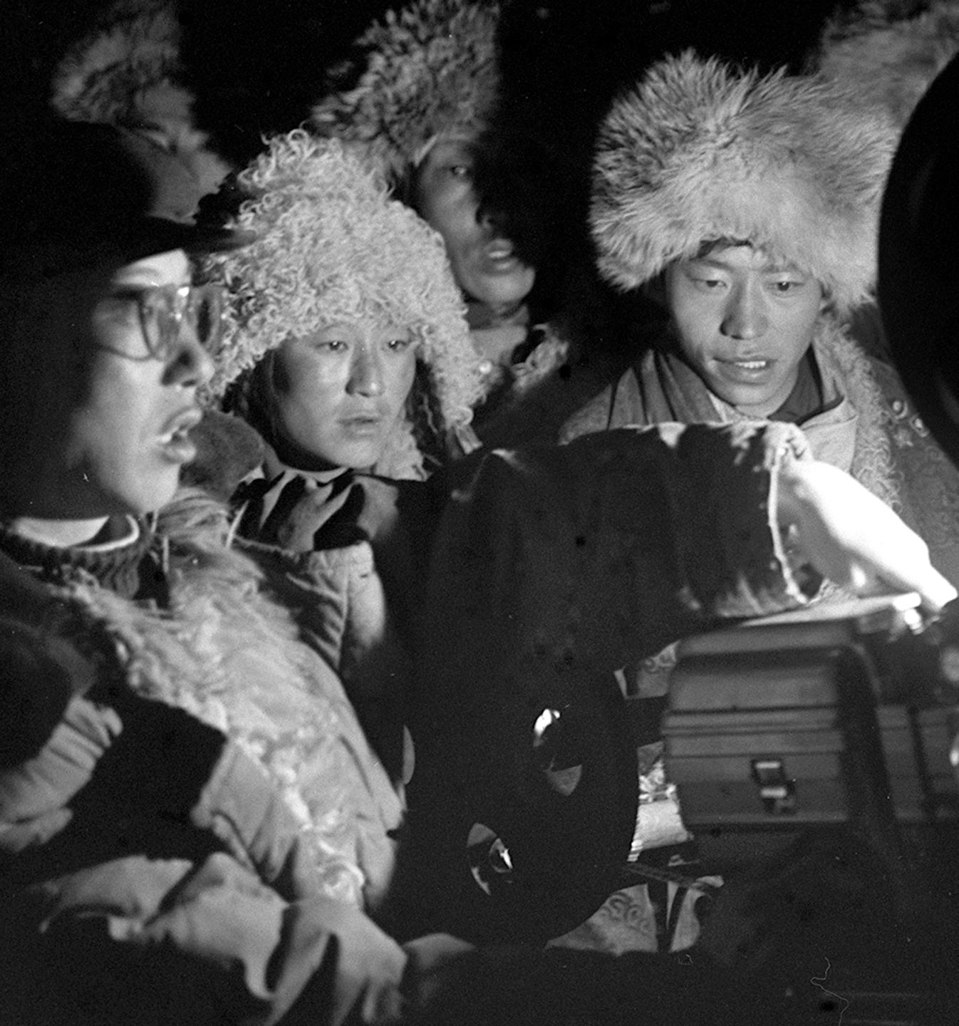 1964年,西藏安多縣的牧民們圍著電影放映機(jī),等待電影開(kāi)演。川藏、青藏公路通車(chē)后,沿路地區(qū)面貌一新,曾經(jīng)荒僻的地方,居民們也能看到電影了。