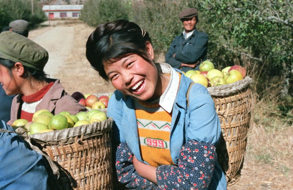 1990年,川藏公路附近,藏族女青年在背運(yùn)蘋(píng)果。