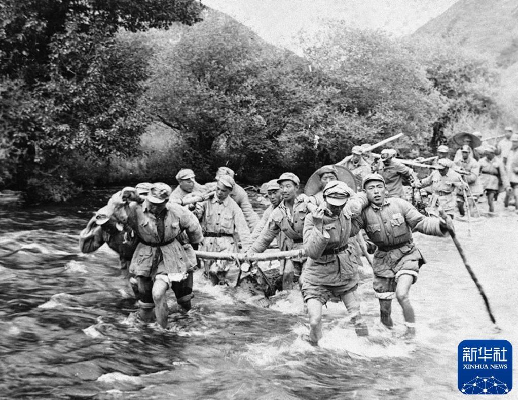 1950年,筑路大軍挺進(jìn)西藏途中,官兵們在冰冷刺骨的河水中抬運(yùn)石料。新華社發(fā)