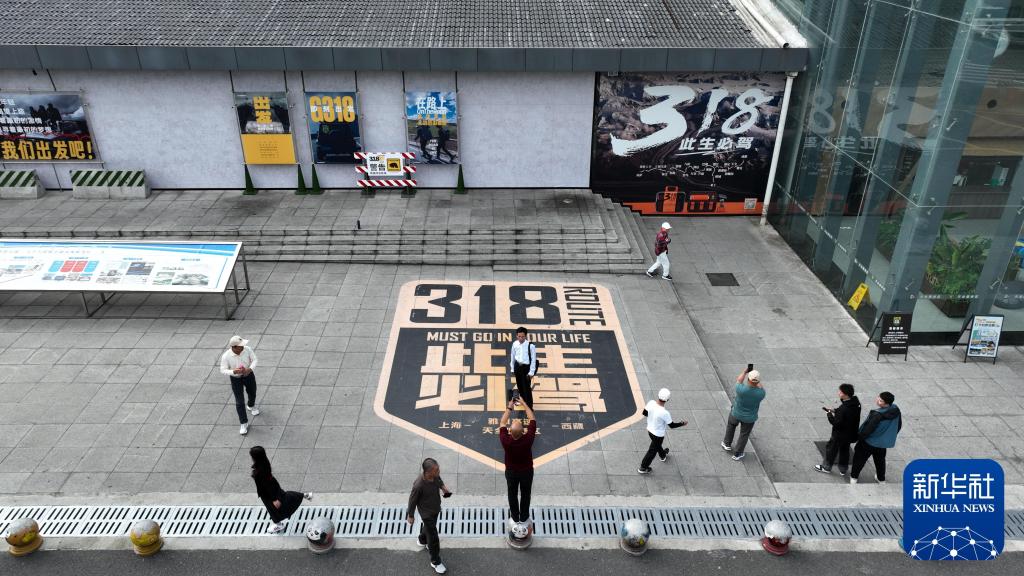 2024年10月27日,游客在雅康高速天全服務(wù)區(qū)地標(biāo)圖案前拍照(無人機(jī)照片)。新華社記者 胥冰潔 攝