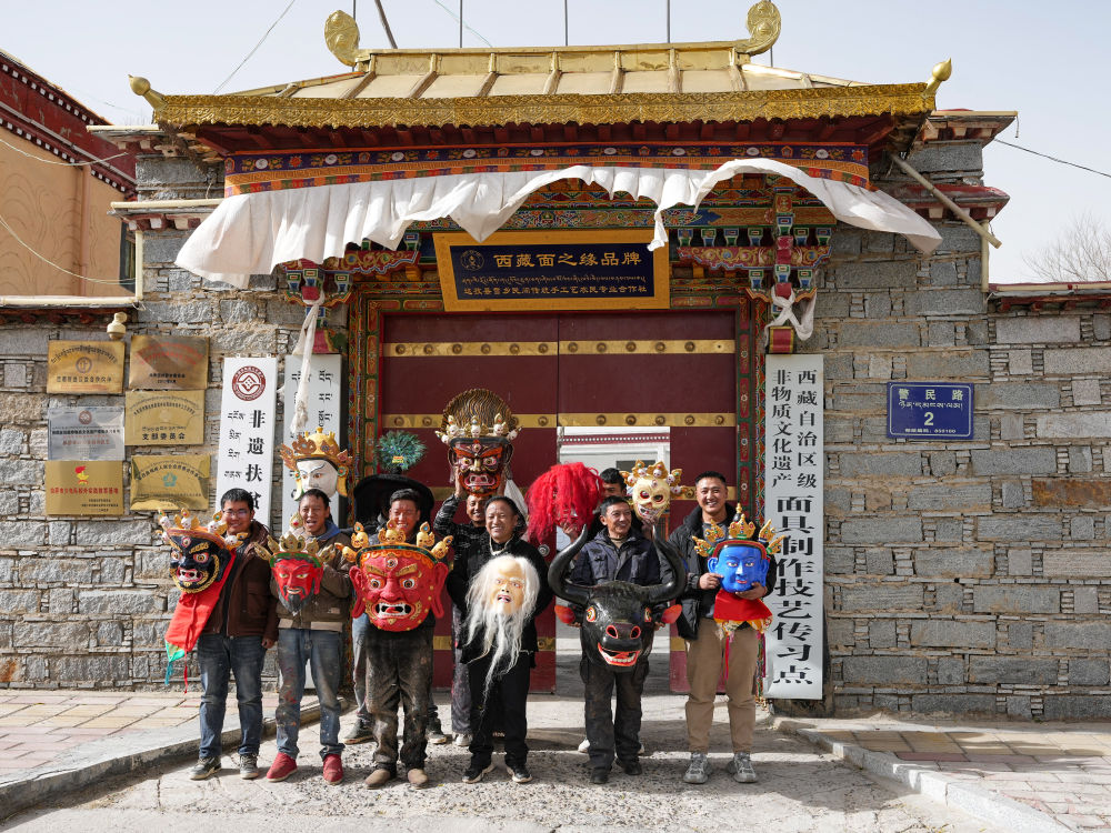 拉薩達(dá)孜區(qū)雪鄉(xiāng)民間傳統(tǒng)手工藝農(nóng)民專業(yè)合作社的工匠在合作社門前的空地上佩戴檢查做好的西藏傳統(tǒng)面具。