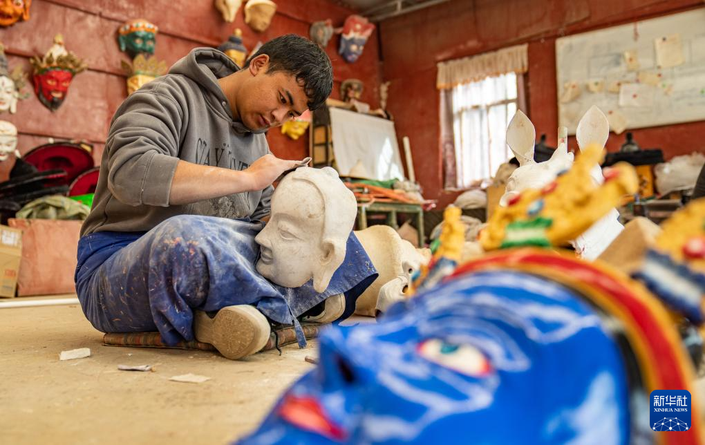 12月9日,拉薩達(dá)孜區(qū)雪鄉(xiāng)民間傳統(tǒng)手工藝農(nóng)民專業(yè)合作社的面具制作工匠制作傳統(tǒng)面具。新華社記者 丁增尼達(dá) 攝