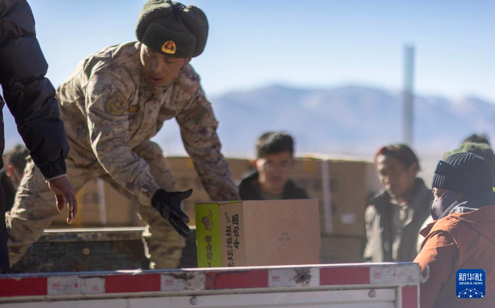 1月8日,解放軍戰(zhàn)士在尼轄鄉(xiāng)雪龍村幫助受災(zāi)群眾搬運(yùn)生活物資。新華社記者 姜帆 攝